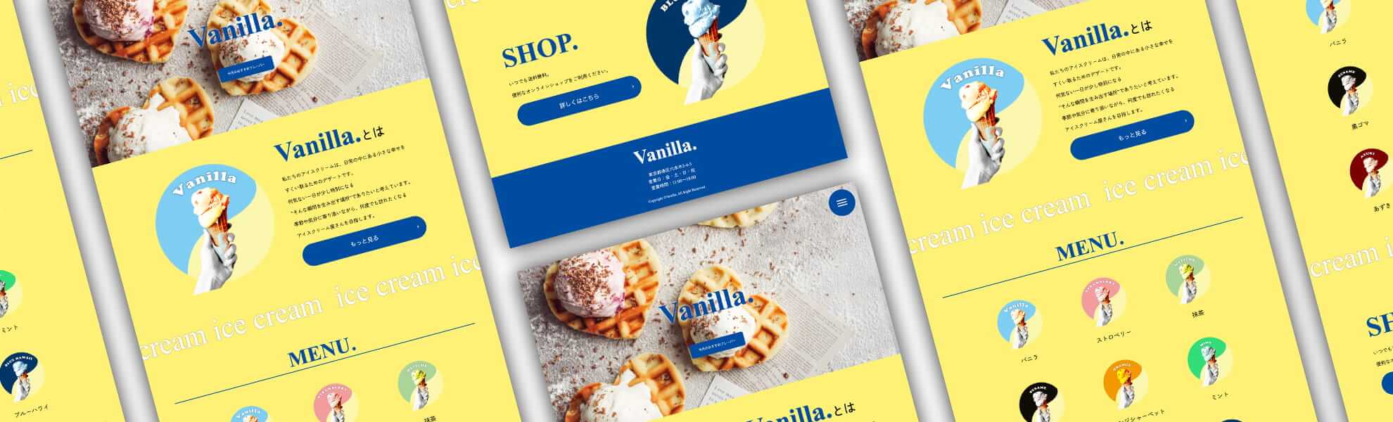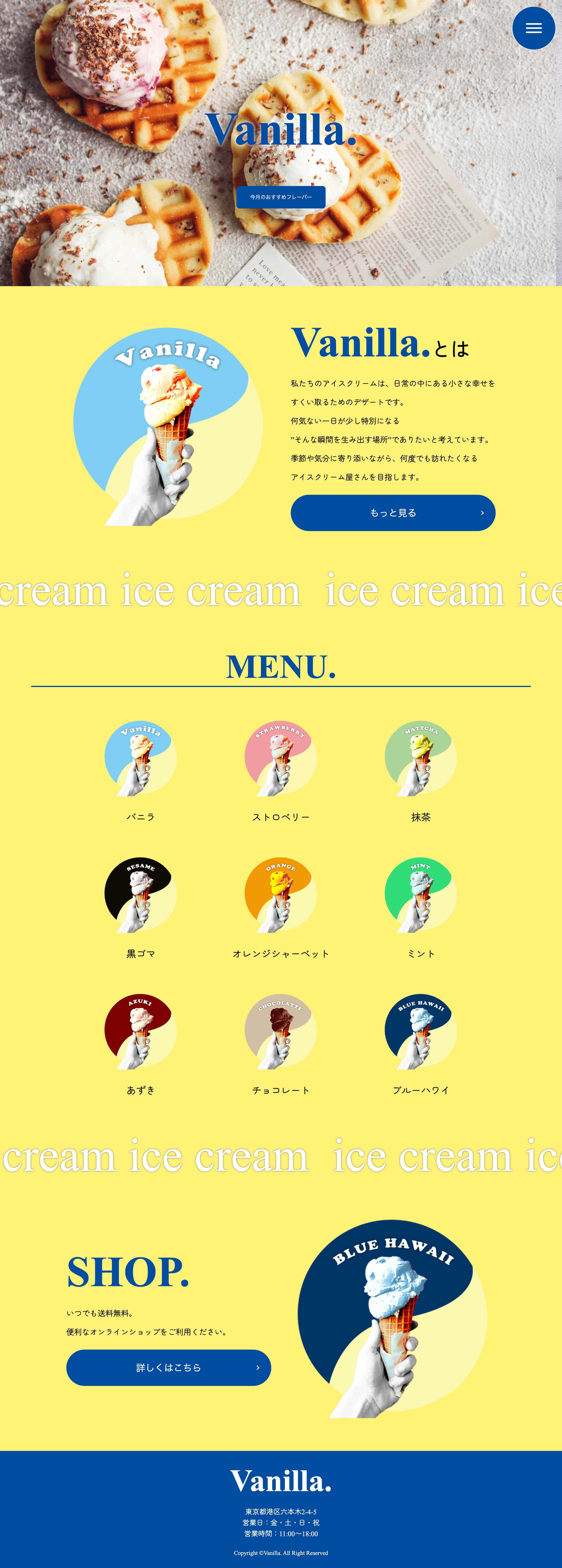 - ブランドカラーである青色と黄色を基調に、 アイスクリームらしい爽やかさと楽しさを表現したデザインを目指しました。 トップ画面にはスライド式を採用することでブランドの世界観を視覚的に演出しつつ、 季節限定フレーバーなどを効果的に訴求できるよう、 「今日のおすすめ」ボタンから画像と説明文が表示されるギミックを搭載しております。 また、MENU一覧ではクリックによる画像拡大設計を取り入れ、 商品の質感や魅力をよりダイレクトに伝えるUIを構築いたしました。 操作性においても、ハンバーガーメニューの設置やレスポンシブ対応により、 PCからスマートフォンまであらゆるデバイスで直感的に扱えるナビゲーション構造を実装しており、 視覚的な楽しさと情報の分かりやすさを高い次元で両立させたLPに仕上げております。